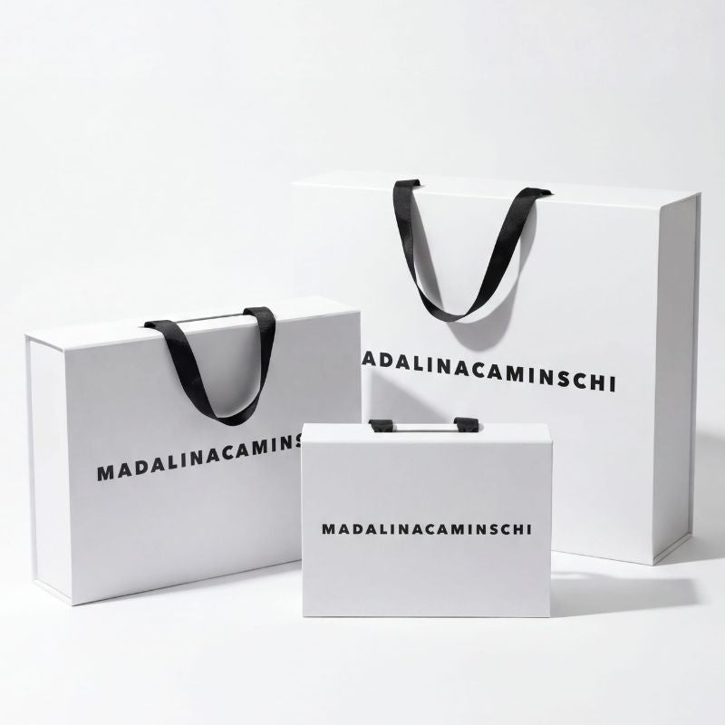 Immerse yourself in the world of Madalina Caminschi through its iconic packaging, crafted with the utmost care for an unforgettable unboxing experience.